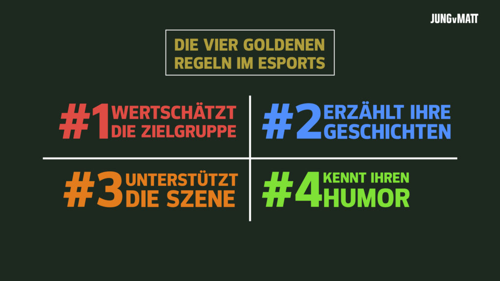 „Das Publikum von E-Sports-Events ist nicht nur jung, smart und kreativ, sondern auch sehr markenaffin. Mit der richtigen Mischung aus Storytelling, Humor und wertschätzender Kommunikation können Brands bei Gamer*innen so richtig punkten“, erklärt Carl Kuhn, Director E-Sports Jung von Matt SPORTS.