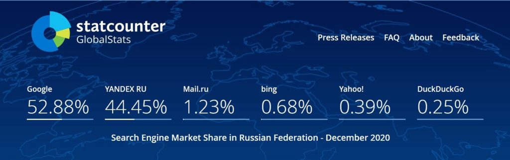Yandex.ru belegt den zweiten Platz hinter Google mit beinahe der Hälfte des Suchmarktes. Auch hier gibt es ein großes Potential für den Reisebereich, Luxusgüter, Dienstleistungen wie Innenausbau und Medizinische Eingriffe.