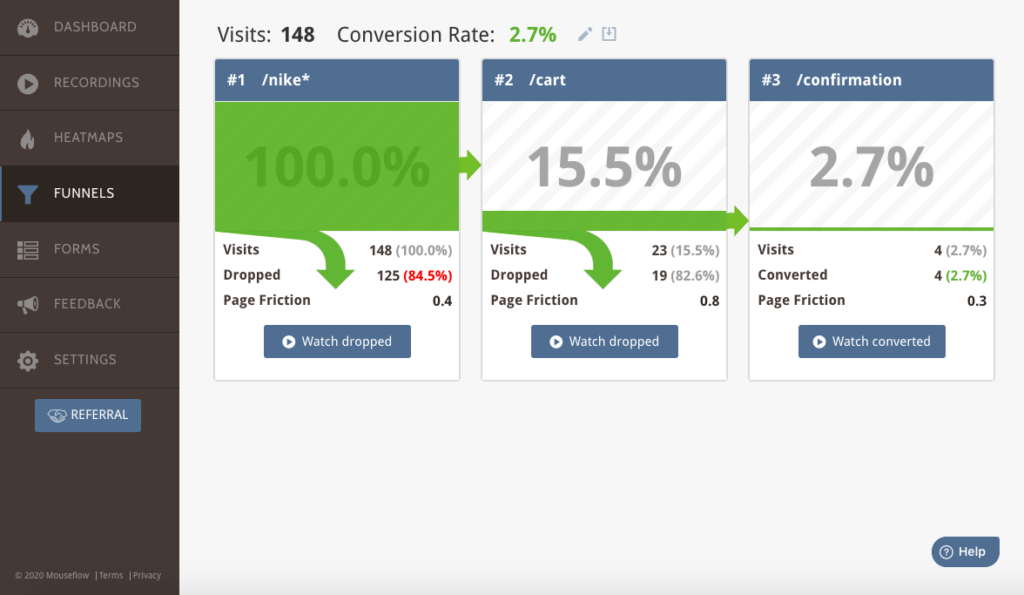 Funnels zeigen in einem Trichter wie viele Nutzer eine Aktion beginnen und diese abschließen. Das nachfolgende Beispiel zeigt, dass 2.7 % der Nutzer einen Kauf abschließen, welche die Produktkategorie /nike besucht haben. Diese Trichter könne auch detaillierter sein. Vor allem dann, wenn ein Formular / Bestellung auf mehrere Schritte verteilt ist.