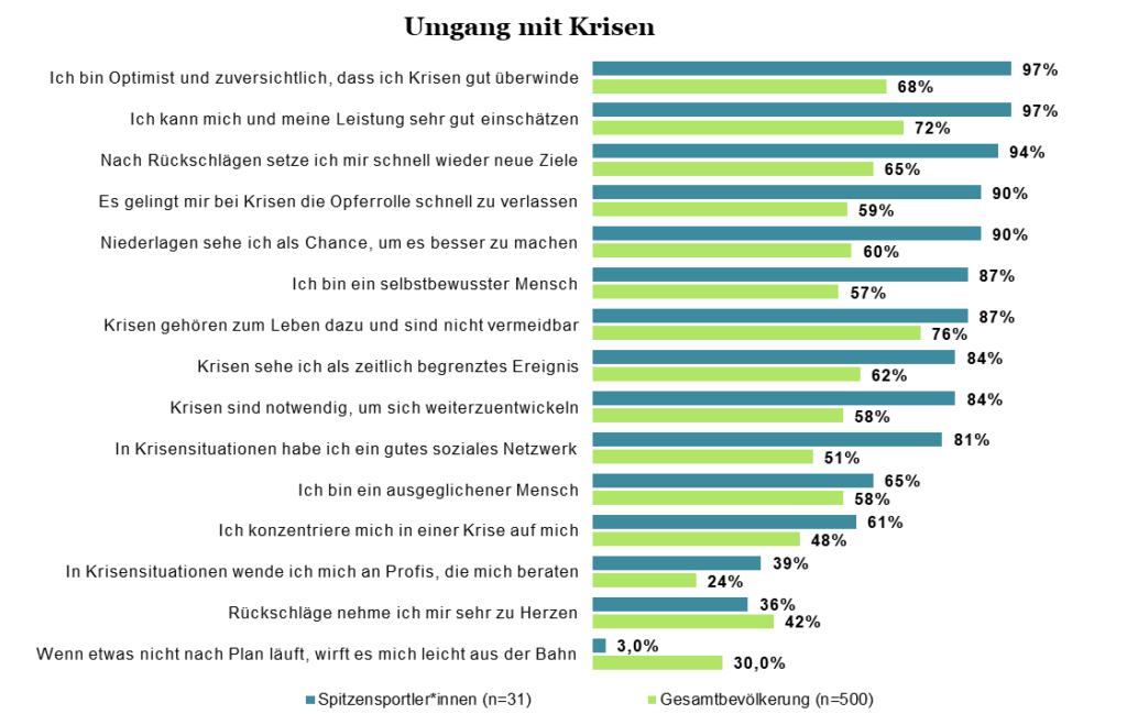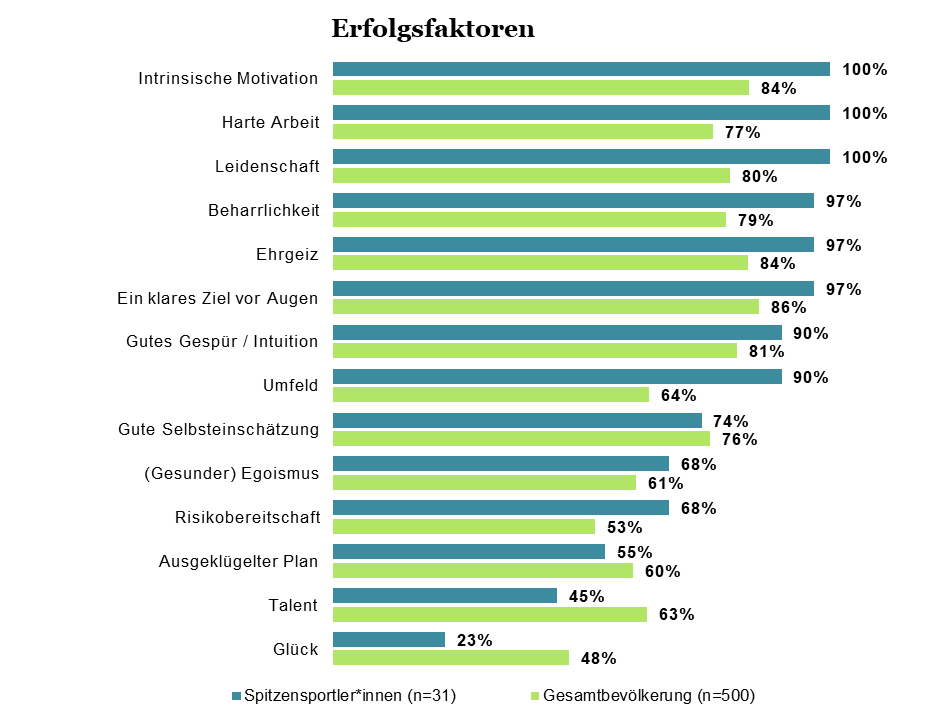 Festzuhalten bleibt jedenfalls, dass die Erfolgsstrategien und Methoden zur Krisenbewältigung der Spitzensportler*innen nicht zufällig gewählt sind, sondern auf eindeutigen Regeln und Prinzipien beruhen. So denken beispielsweise 48% der Gesamtbevölkerung, dass der Faktor „Glück“ einen starken Einfluss auf den persönlichen Erfolg hat. Unter den befragten Athlet*innen sind es hingegen nur 23%.