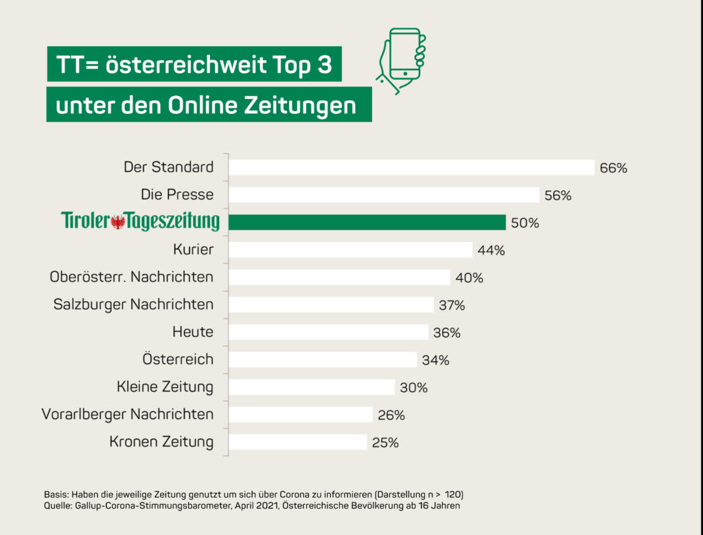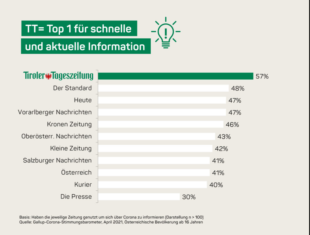 Marktforschungsinstitut Gallup und Medienhaus Wien haben österreichweit die Mediennutzung während der Corona-Pandemie untersucht. Dabei erzielte die Tiroler Tageszeitung Top-Werte für schnelle und aktuelle Information, persönliche Nützlichkeit und Verständlichkeit. Besonders auch die Jüngeren haben sich während der Pandemie und zu Corona verstärkt auf den Kanälen der Tiroler Tageszeitung informiert.