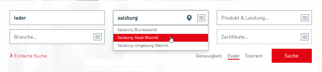 Durch die Such-Abfrage entsteht eine lesbare und dauerhaft gültige URL. Anhand der zuvor ausgeführten Suche nach Leder und Salzburg ergibt sich die Zielseite https://firmen.wko.at/leder/salzburg/.