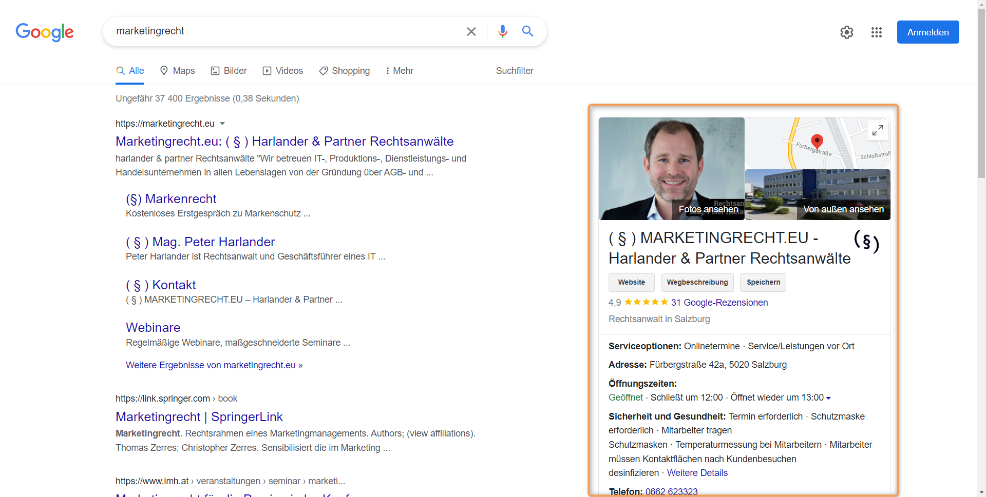 Der Eintrag erscheint bereits Minuten nach der Erstellung, wenn eine Suchanfrage bei Google getätigt wird. Es kann aber auch sein, dass es ein Unternehmen und seinen Standort bereits bei Google gibt. Das liegt daran, dass die Wirtschaftskammer Unternehmensdaten für Google zur Verfügung stellt.
