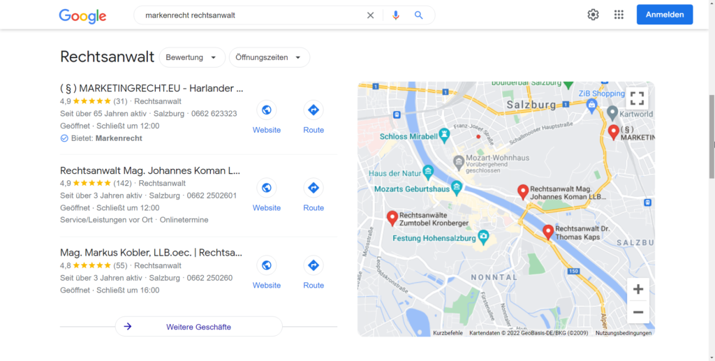 Bei einer Suchabfrage, die für Google einen Ortsbezug hat, wird die Darstellung verändert und im Suchergebnis in der Mitte bis zu drei oder rechts ein Unternehmenseintrag angezeigt.