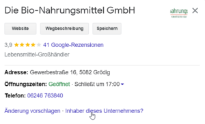 Ist das eigene Unternehmen gefunden, kann es mit einem Klick auf Inhaber des Unternehmens beansprucht werden (Claiming). Das funktioniert bei allen Business Plattformen ähnlich. Übernehmen Sie immer bestehend Einträge da diese wertvoller für Ihre Auffindbarkeit sind, Sie haben eine höhere Glaubwürdigkeit da von Google selbst erstellt.