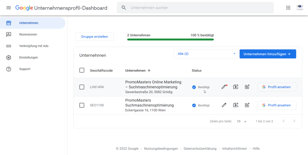 Pro Standort sollte ein Unternehmen nur einen (1) Eintrag haben. Finden Sie weitere Einträge für einen Standort bei Google was immer wieder vorkommt, dann ist es empfohlen diese Einträge zu claimen und als Duplikat in der Verwaltungsoberfläche zu markieren.