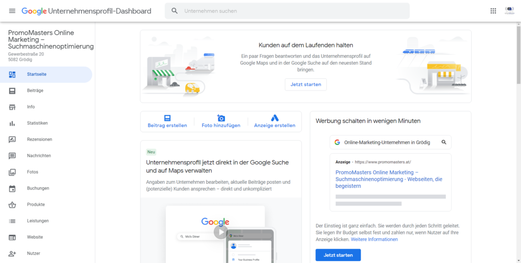 Im eigenen GMB Eintrag können viele nützliche Funktionen und Möglichkeiten genutzt werden, um einen Eintrag noch besser Sichtbar und noch auffälliger zu machen. Google führt Sie aber auch Schritt für Schritt zum optimalen Profil.