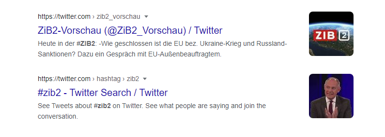 Aber auch ganze Tweets werden in Suchmaschinen gefunden. Beispielsweise bei der Suche nach #zib2 werden Twitter Beiträge angezeigt. Der Fokus von Twitter liegt bei Information & News.