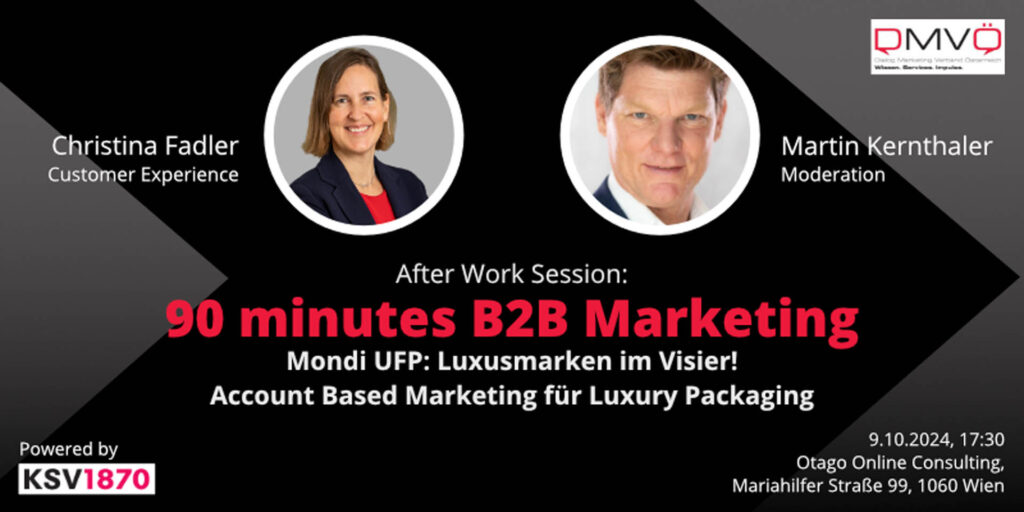 Tauchen Sie ein in eine faszinierende Session von 90 Minutes B2B und lernen am 9. Oktober ab 17:30 Uhr von Christina Fadler, Head of Customer Experience bei Mondi Uncoated Fine Paper, wie Luxusmarken gezielt angesprochen werden. Bei diesem Event dreht sich alles um eine wegweisende Account Based Marketing Kampagne, die es geschafft hat, schwer erreichbare Entscheider:innen in der Luxusbranche für das Segment Luxusverpackungen zu gewinnen.